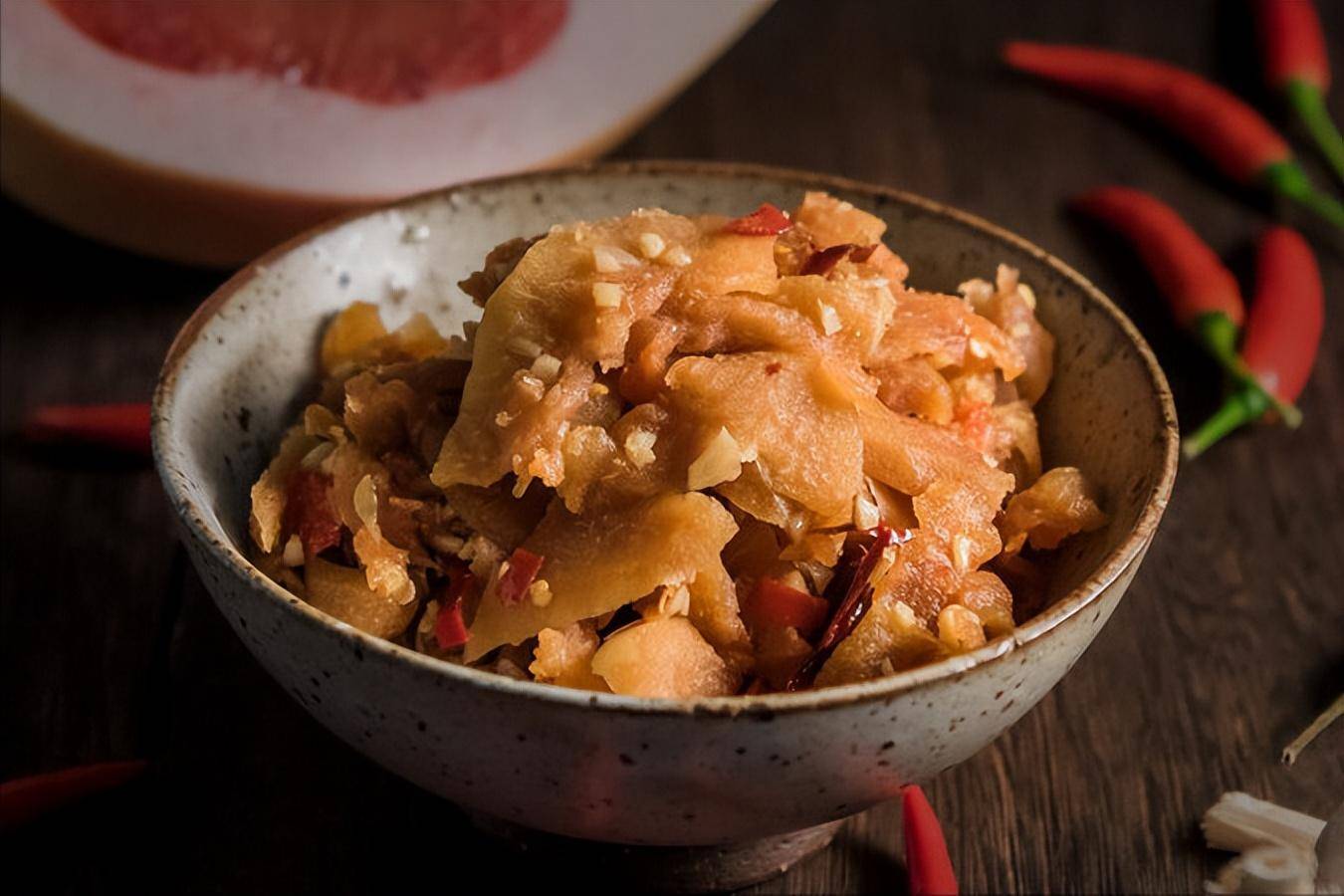 江西南昌人对皮有着很深的执念,凡是皮,好像都可以拿来当做小菜,当然这其中最火的那一定是柚子皮了,吃完的柚子皮不要扔掉,经过去外表的皮,然后滚水浸泡直接放凉,然后继续浸泡,经过多次的浸泡之后,然后挤干和调料一起拌匀即可。