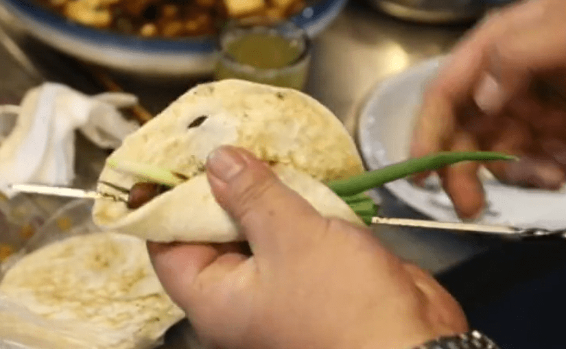 圆圆的小饼,将山东特产香葱与新鲜出炉的烤肉卷在一起,一口下去,肉质鲜美,满口清香。