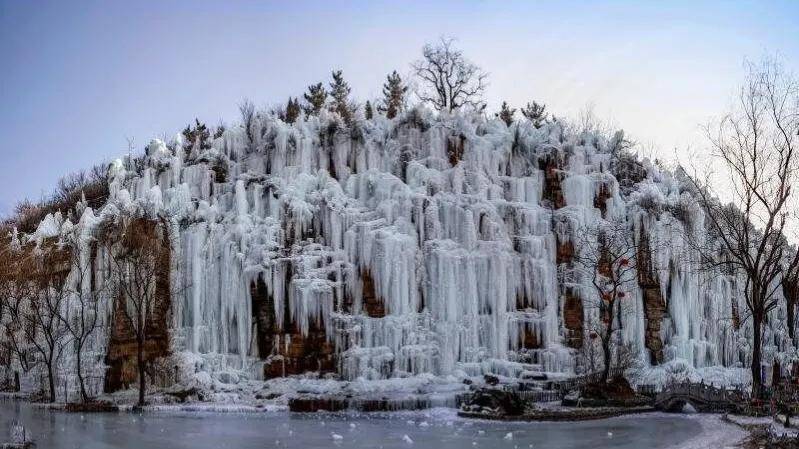 迎宾大瀑布定格成一幅令人遐想的天然艺术冰雕,冰瀑造型各异,晶莹剔透,尽展浩瀚之气魄。
