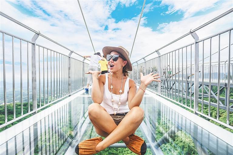 外国游客体验呀诺达景区高空玻璃栈道。 武昊 摄