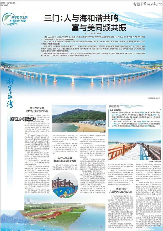 “‘省级山水林田湖草海一体化保护和修复工程’也已申报成功。接下来,我们希望通过推进更多项目,努力打造一个水清、岸绿、滩净、湾美的美丽三门。”三门县自然资源和规划局有关负责人说。