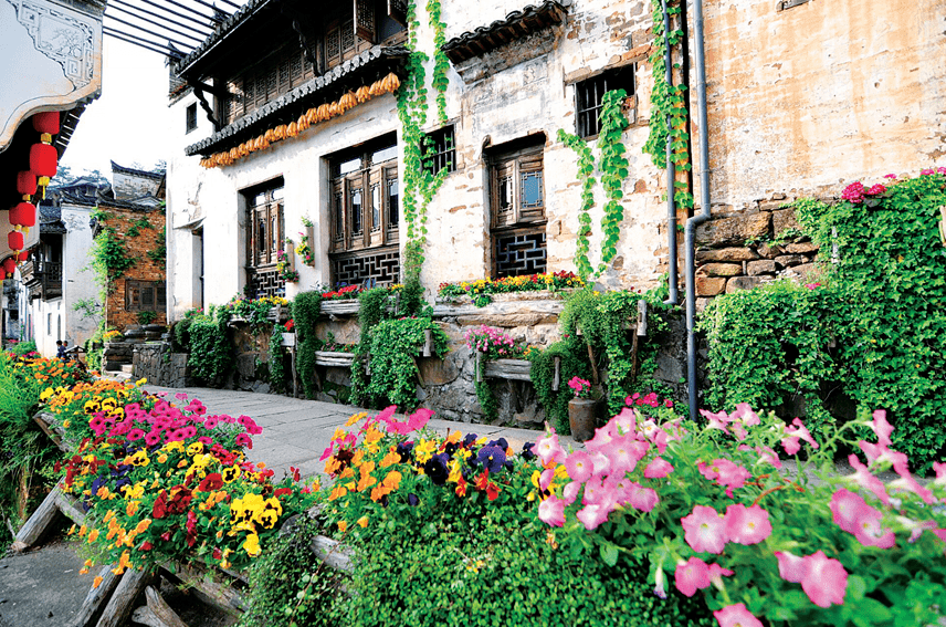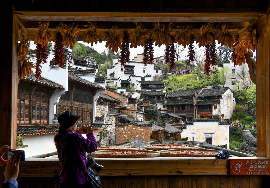 在鲜花小镇、晒秋人家——篁岭记录下晒秋美景。近千年历史的李坑景区内明清古建筑遍布,民居宅院沿涧依山而立,粉墙黛瓦,参差错落,构筑了一幅“远树平林村落,小桥流水人家”的独特景观,令人赏心悦目。