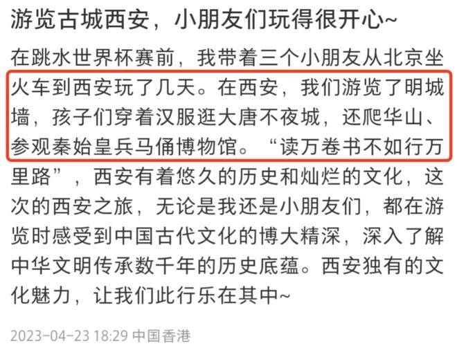 4月23日18:29,郭晶晶在社交平台高调发文,不过,不是跟老公霍启刚秀恩爱,而是晒自己带着三个儿女外出旅游的真实现状。令人没有想到的是,虽然郭晶晶是个大明星,还是豪门儿媳,但是,外出旅游却十分接地气,带着孩子们度过了一段十分美好又有意义的时光。不少网友看后,纷纷表示:“穿汉服,逛西安,晶晶果真教子有方!”