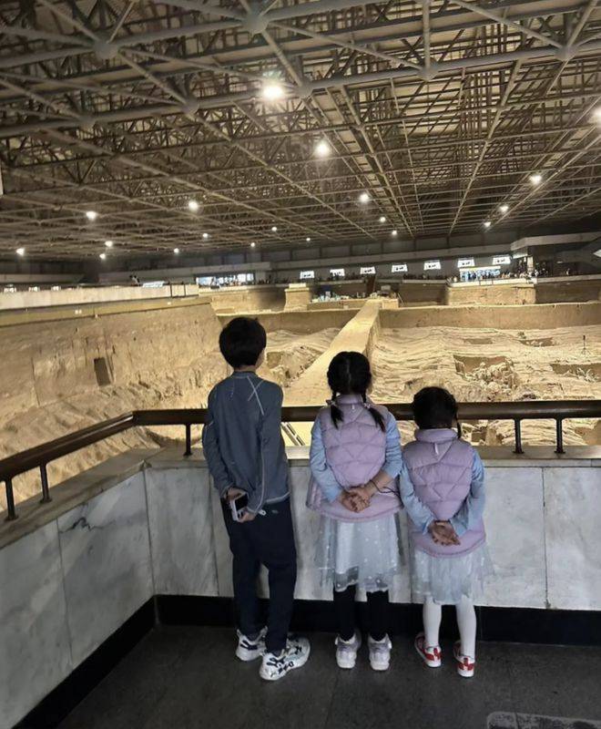 3、除此以外,郭晶晶还带着孩子们爬华山、参观兵马俑。郭晶晶说“读万卷书不如行万里路”。西安悠久的历史和灿烂的文化,让自己和孩子们都感受到了中国古代文化的博大精深。