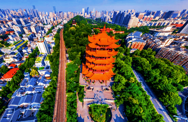 上图:武汉长江畔蛇山上标志性的文化旅游景点黄鹤楼。