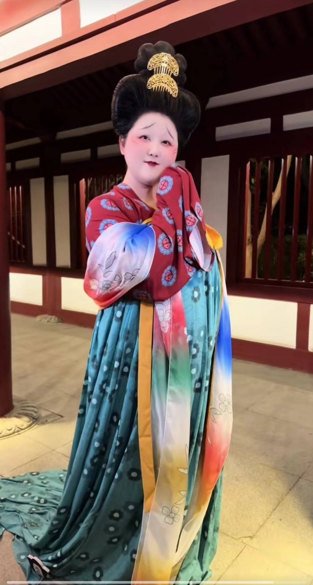 朱红屋檐下,丰腴女子穿着一袭红绿襦裙,粉面朱唇,一双细眉低垂,犹如从唐代壁画里走出来的仕女。4月24日,九派新闻联系上主人公长歌,她介绍,这个妆容名为时世妆,是盛唐时期流行的女子面妆。