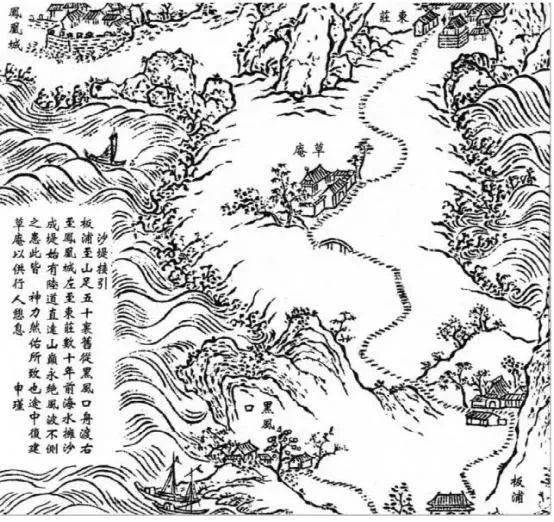黄申瑾《图二十四景》记载,板浦至山足五十里,旧从黑风口舟渡,右至凤凰城,左至东庄。数十年前,海水壅沙成堤,始有陆道,直达山巅,永绝风波不测之患,此皆神力默佑所致也。途中复建草庵,以供行人憩息。