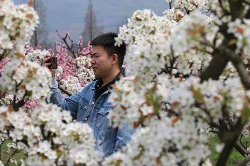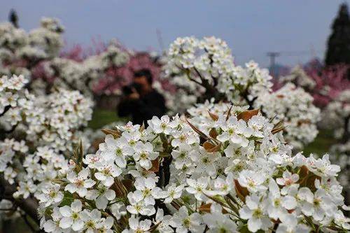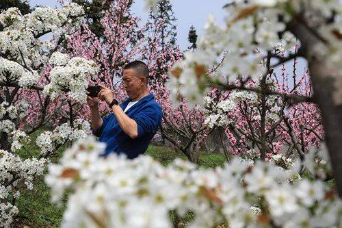 游客拍摄桃花红梨花白的春天美景(王春府 摄)
