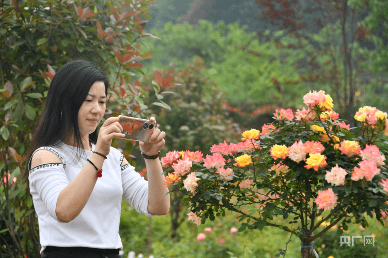 玫瑰花海里,游客忙着打卡拍照(邱文丽 摄)