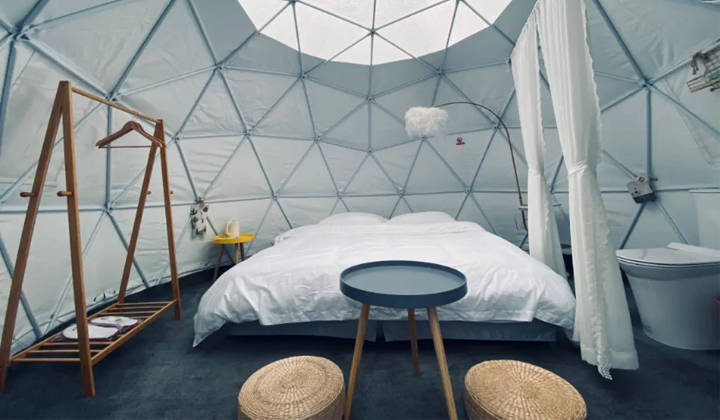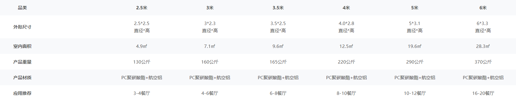 以知名品牌星空梦所产的星空帐篷(星空帐篷也可称为:星空房)为例,目前主要可提供2.5-6米直径星空房,面积为4.9-28.3平方,根据不同的使用需求可选择不同的星空帐篷,其中3.5米、4米直径是大家选择比较多的,作为餐厅使用,3.5米可容纳6-8人,4米可容纳8-10人左右。即使是用来作为住宿房也可放置1.2-1.8米的双人床,并可拼装一个2.5米直径的小型星空房作为卫生间使用。