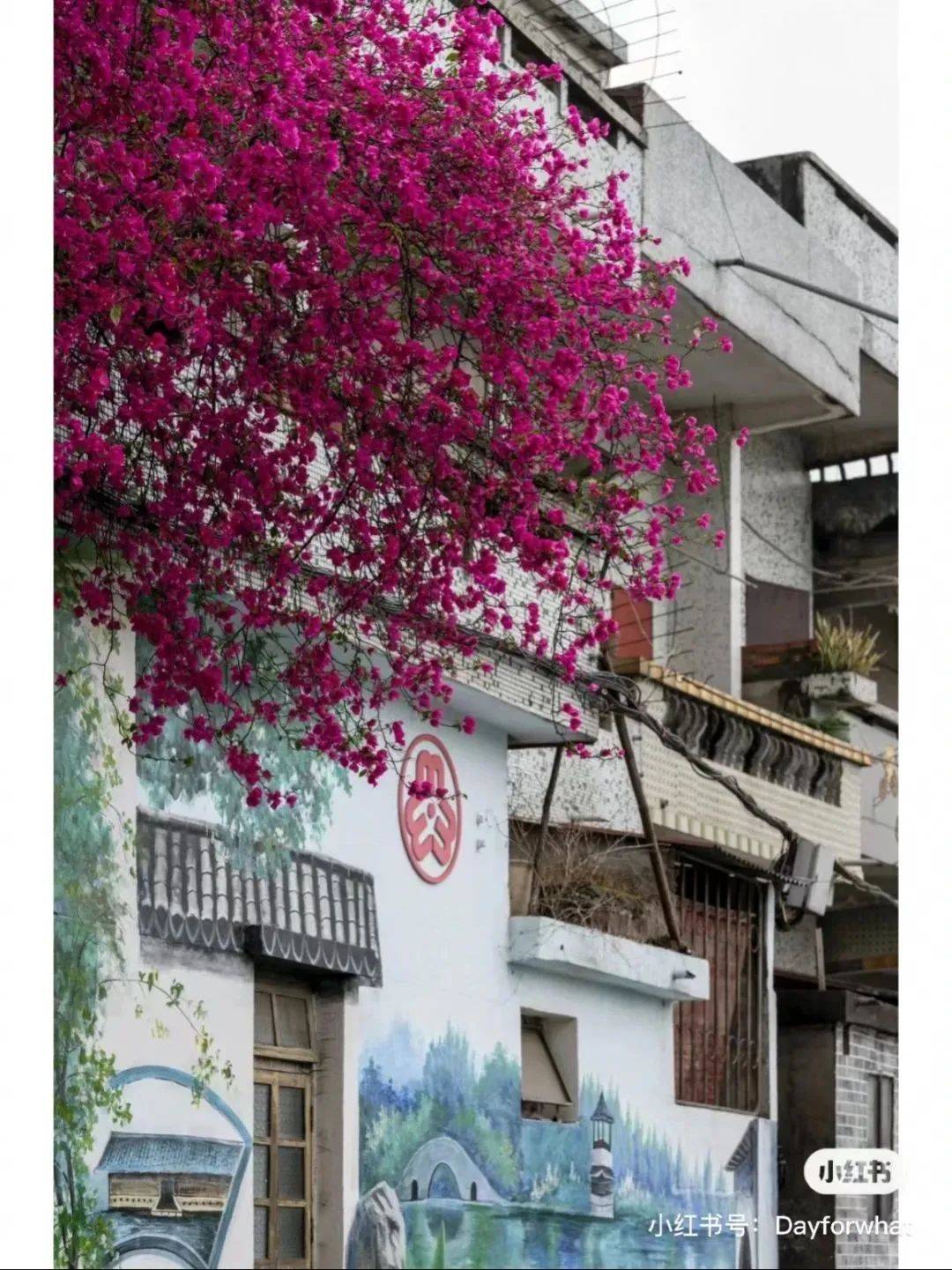 笔记内容:位于企石上洞村的大路上某民宅外墙上,有一大片盛开的三角梅。