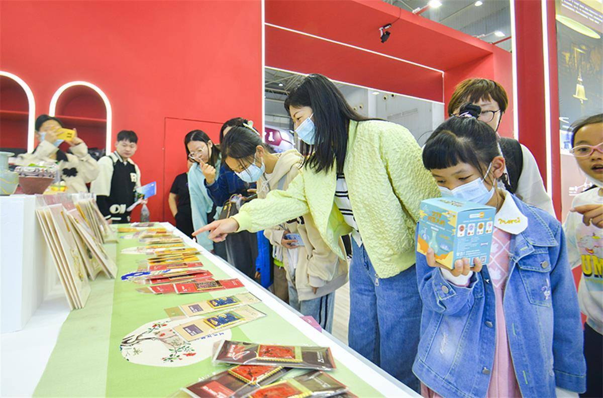 在文创产品展示区,唐宫夜宴文创、豫游纪、黄河之礼、非遗剪纸等优秀文创产品让现场一大批游客和小朋友们爱不释手,纷纷扫码购买,现场一度排起了长龙。