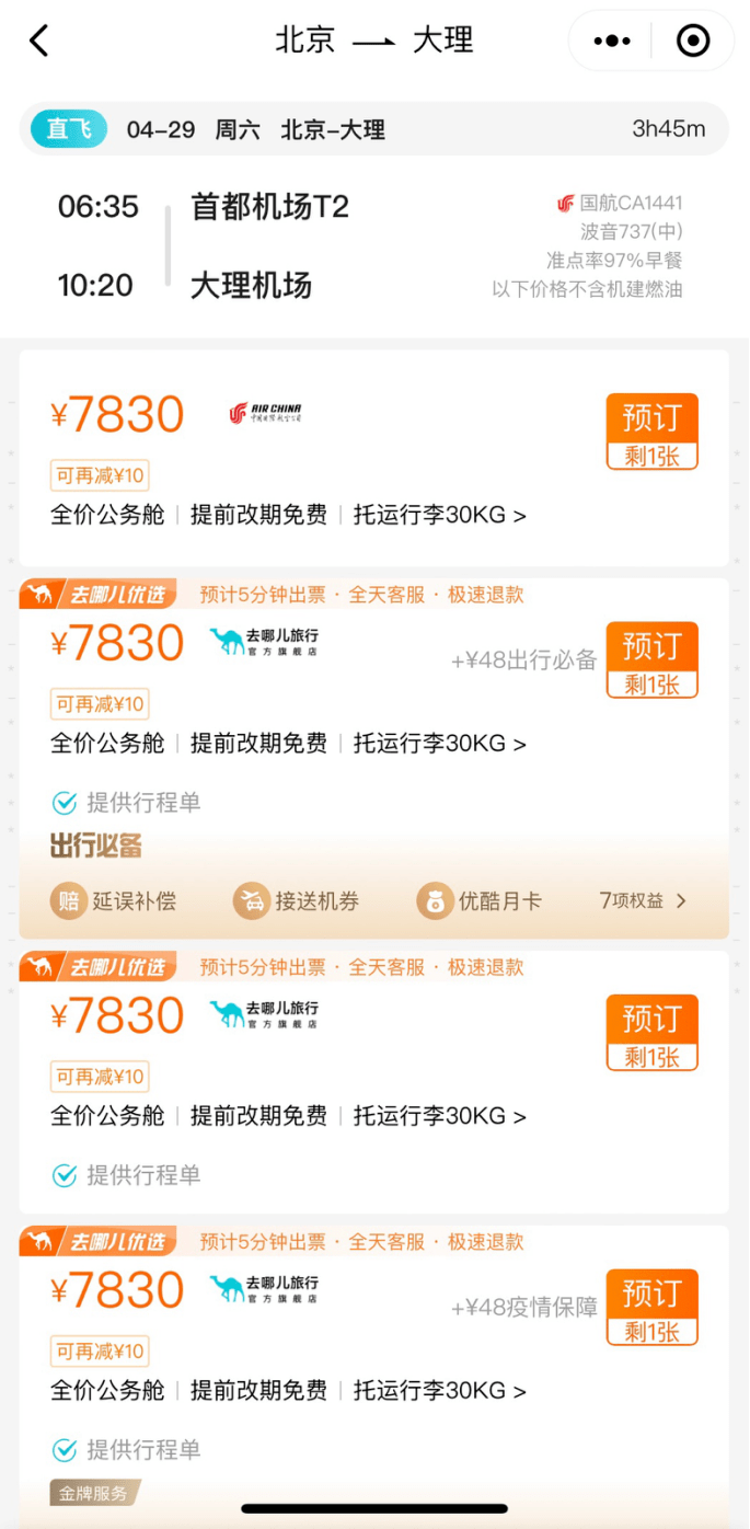 去哪儿数据显示,截至4月17日,五一期间出行的机票提前预订量超过2019年同期,机票平均支付价格较2019年增长近五成。4月29日,北京-广州、深圳-上海、上海-成都等多条航线,经济舱机票价格已升至全价,北京-大理等航线经济舱已售罄。