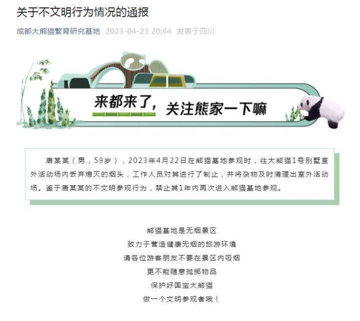 通报称,唐某某(男,59岁)于2023年4月22日在熊猫基地参观时,往大熊猫1号别墅室外活动场内丢弃熄灭的烟头,工作人员对其进行了制止,并将杂物及时清理出室外活动场。鉴于唐某某的不文明参观行为,禁止其1年内再次进入熊猫基地参观。