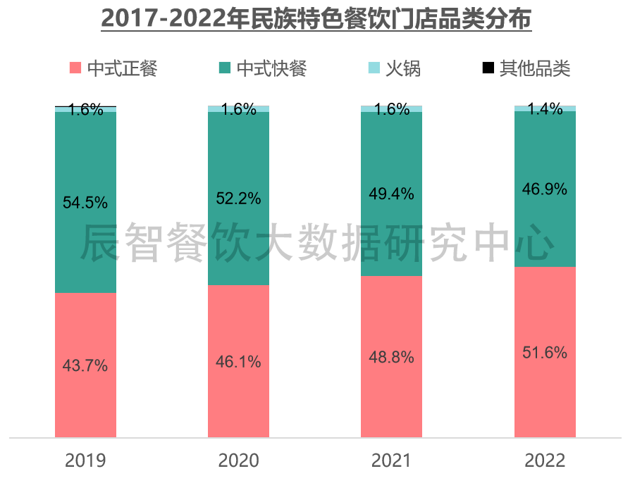 从餐厅品类来看,中式正餐占比在2019-2022年持续上升,2022年达到51.6%,具有正餐属性的民族餐饮稳定性更强。