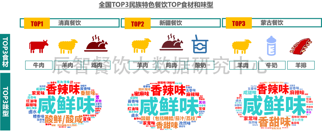 在全国TOP3民族特色餐饮(清真餐饮、新疆餐饮、蒙古餐饮)中,咸鲜味和香辣味都是主流味型。
