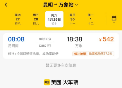在美团火车票购票页面查询显示,4月刚开行的“中国昆明-老挝万象”的国际旅客列车,4月28、29、30三日的火车票已售罄。来自昆明的邓小姐提前抢到了两张火车票,计划在“五一”期间带着家人“二刷”这条热门路线。“这是一种‘沉浸式’的出国体验,列车上的广播服务、旅客信息都有中文、老挝语和英语三种版本。高铁上会有特色表演供欣赏,窗外沿途的风景也很美。”邓小姐说。