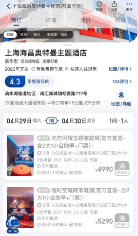 不少热门景区的门票预订量增幅显著。上海海昌海洋公园“五一”假期前一周门票预订量是2019年同期6倍,“五一”假期期间门票预订量超2019年预订量约13倍,外地客源占比从五成提升至七成。截至发稿时,奥特曼主题酒店已几近满房。