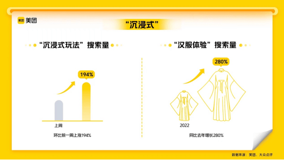 其中,以“汉服体验”为代表的新型沉浸式游玩方式,受到越来越多的年轻人青睐。美团数据显示,截至4月23日,“汉服体验”的搜索量同比去年增长280%,西安、洛阳、苏州位居搜索热度前三。以洛阳为例,街头随处可见身着汉服“穿越”打卡的游客,汉青阁汉服体验店负责人常云介绍,今年到店体验“变装”的游客量,比刚开业时翻了好几倍。