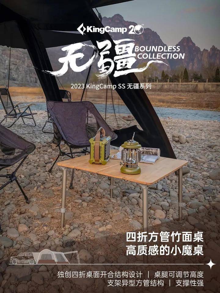KingCamp四折方管竹面桌,高质感、会变身的小魔桌,独创四折桌面开合结构设计;桌腿可调节高度;支架异型方管结构,支撑性强。