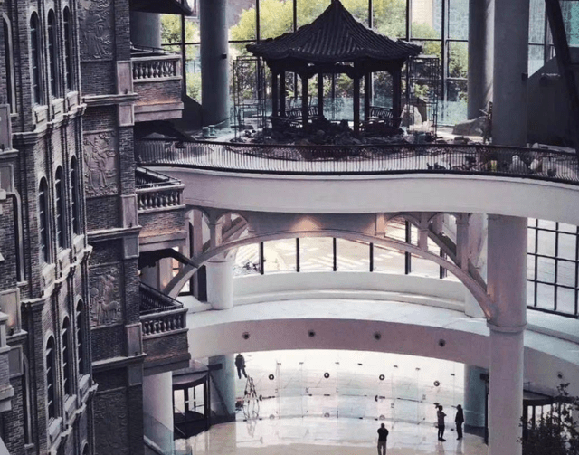 在7万平方米的超大house里,设计师想出山坡和山洞两种风格,顶端的问蟾亭与望山亭两亭相对,都是典型的景区设计手法。