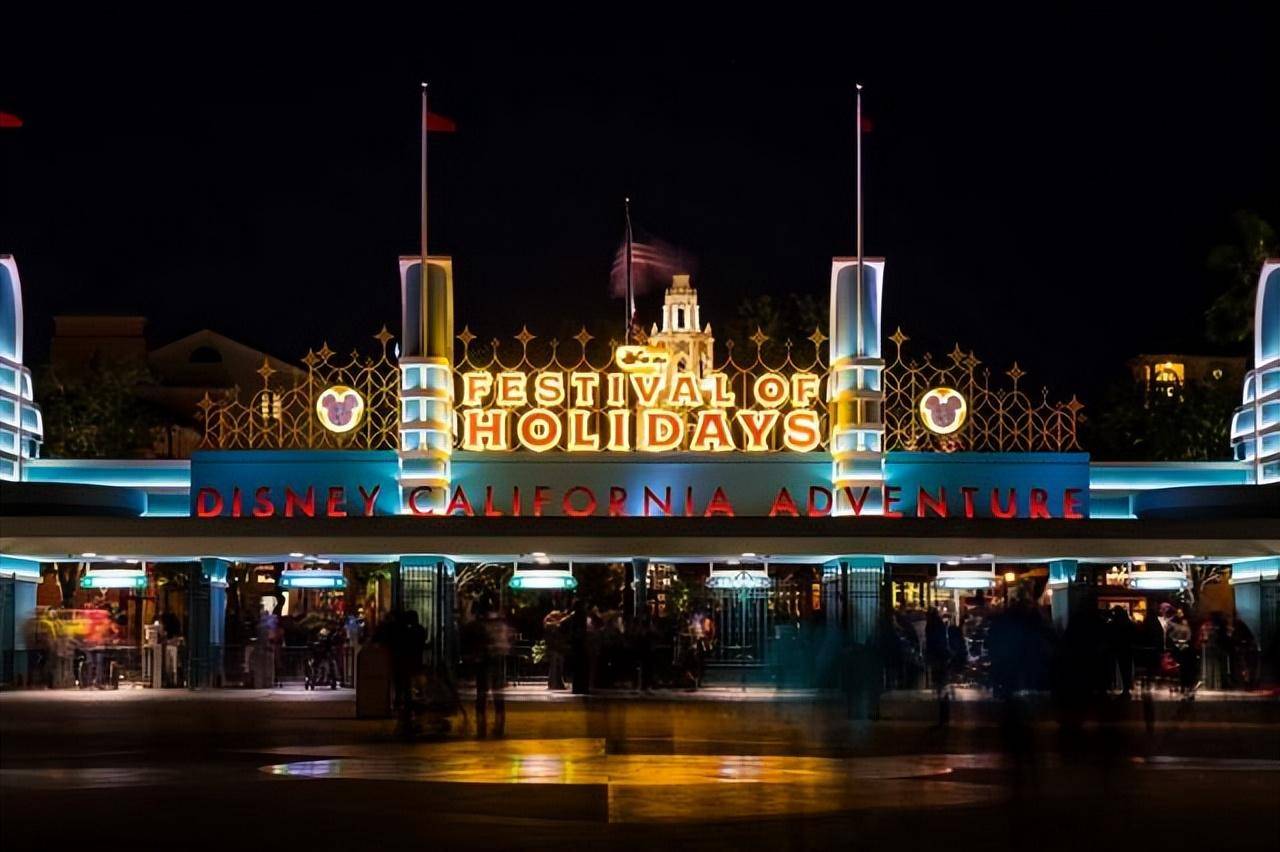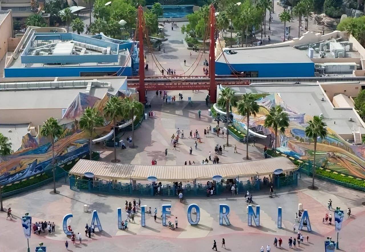 加州冒险乐园的入口和售票同样是低矮铁门,呈扇形布置。广场前放置了一组加州的英文字母雕塑,后面则是以缩小版金门大桥为背景。