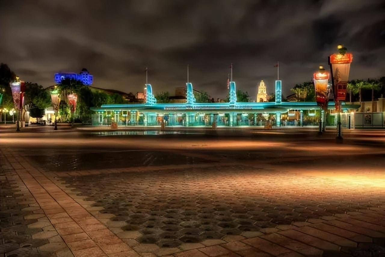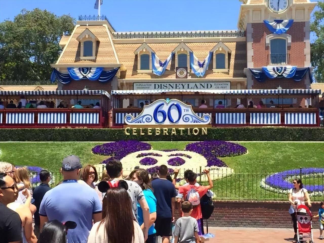 加州迪士尼乐园分内外广场。售票亭和闸机呈扇形布置,入口低矮铁门以火车站作为背景