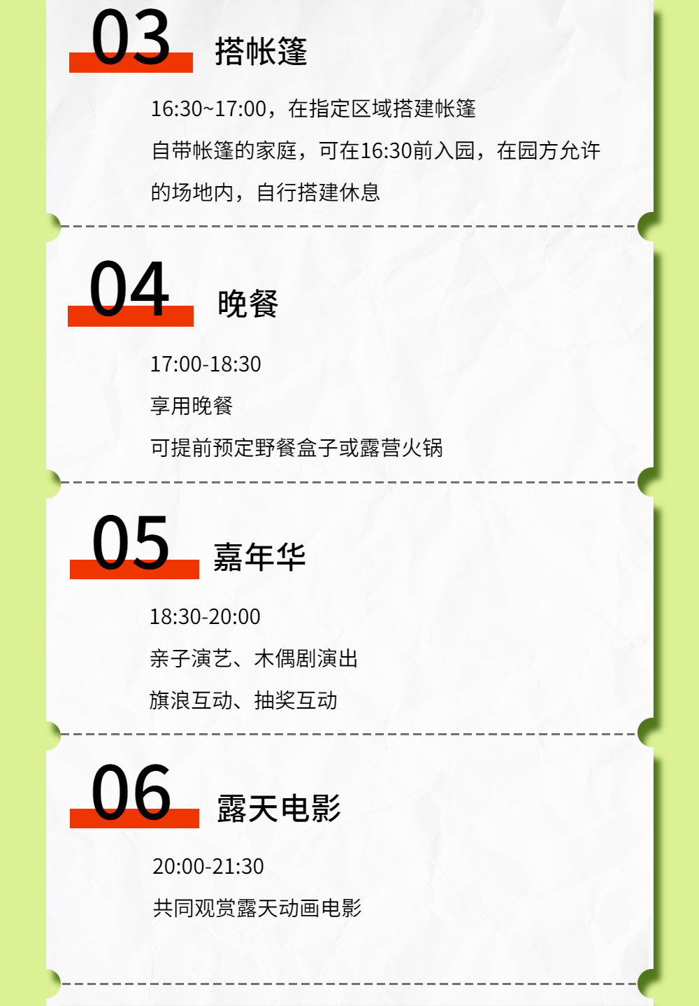 ②租借帐篷的家庭,可先入园游玩,请于16:30以后,前往露营节指定区域,领取露营装备。