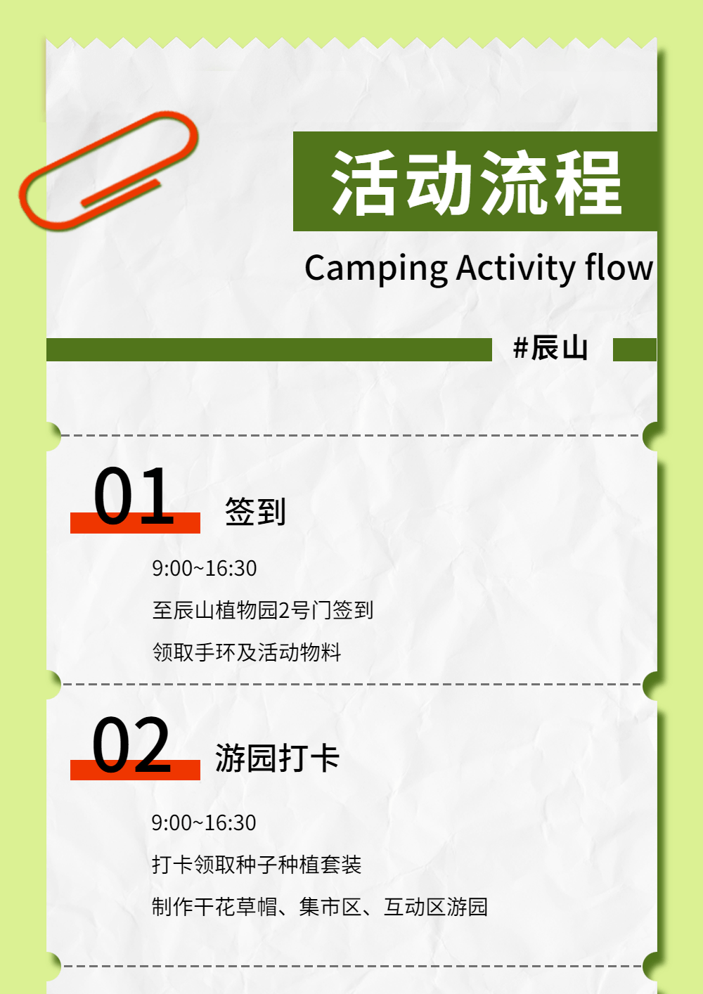 费用包含:露营节活动费+25平米营位费+2成人辰山植物园门票+“辰山物语”挑战任务书+“辰山物语”文创-种子种植套装+干花草帽手作包