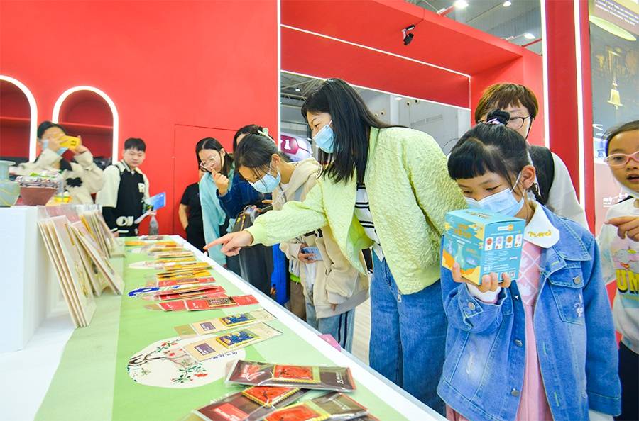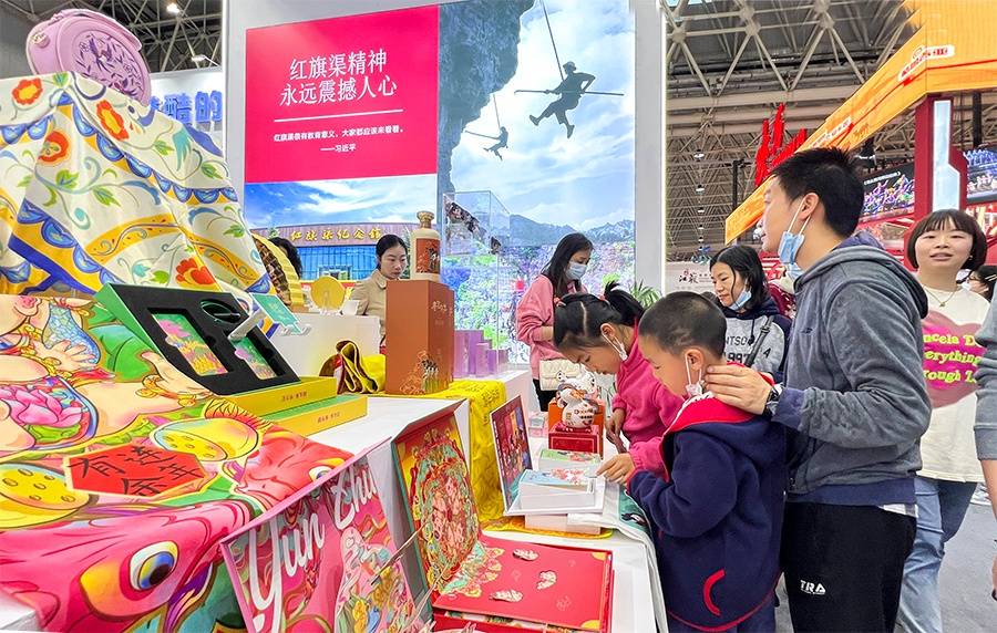 在文创产品展示区,唐宫夜宴文创、豫游纪、河南博物院豫博文创、非遗剪纸等优秀文创产品让现场一大批游客和小朋友们爱不释手,纷纷扫码购买,现场一度排起了长龙。