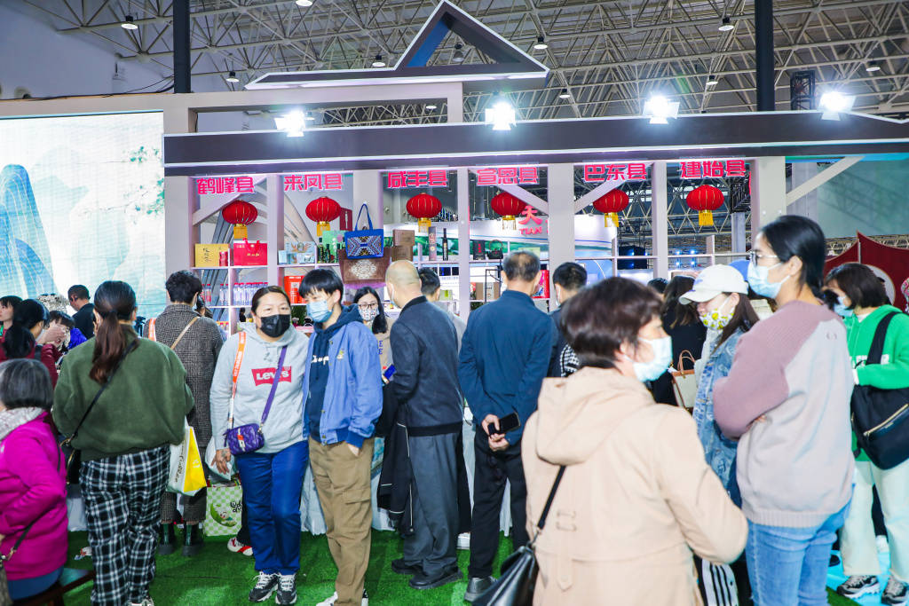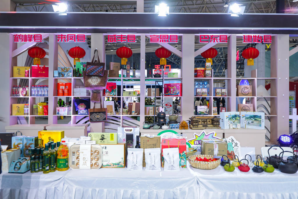 恩施州展馆中,咸丰旅游产品——坪坝营景区、唐崖土司城遗址景区、唐崖河景区,咸丰农特产品——咸丰唐崖白茶、咸丰唐崖藤茶、咸丰土家手工麻糖、小村红衣米花生、唐崖神话甜红酒、咸丰富硒大米系列、咸丰土家糍粑,唐崖土司系列文创产品,不断吸引游客驻足,既让游客们沉浸式感受美丽咸丰,又能在逛、玩、吃中了解咸丰美食特色。