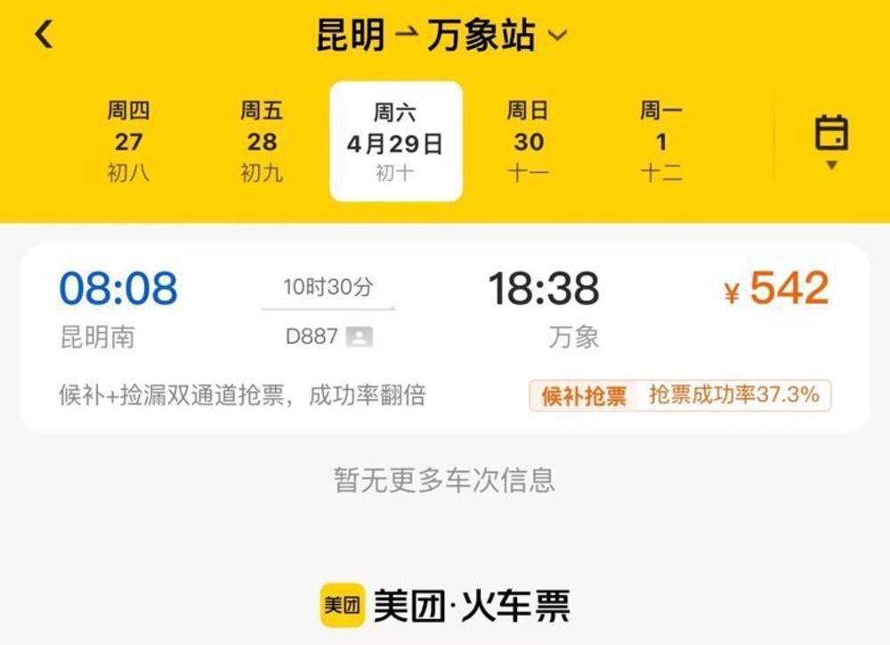 记者在美团火车票购票页面查询,4月刚开行的“中国昆明-老挝万象”的国际旅客列车,4月28、29日、30日三天的火车票已售罄。来自昆明的邓小姐提前抢到了两张火车票,计划在五一期间带着家人“二刷”这条热门路线。“这是一种沉浸式的出国体验,列车上的广播服务、旅客信息都有中文、老挝语和英语三种版本。高铁上会有特色表演供欣赏,窗外沿途的风景也很美。”