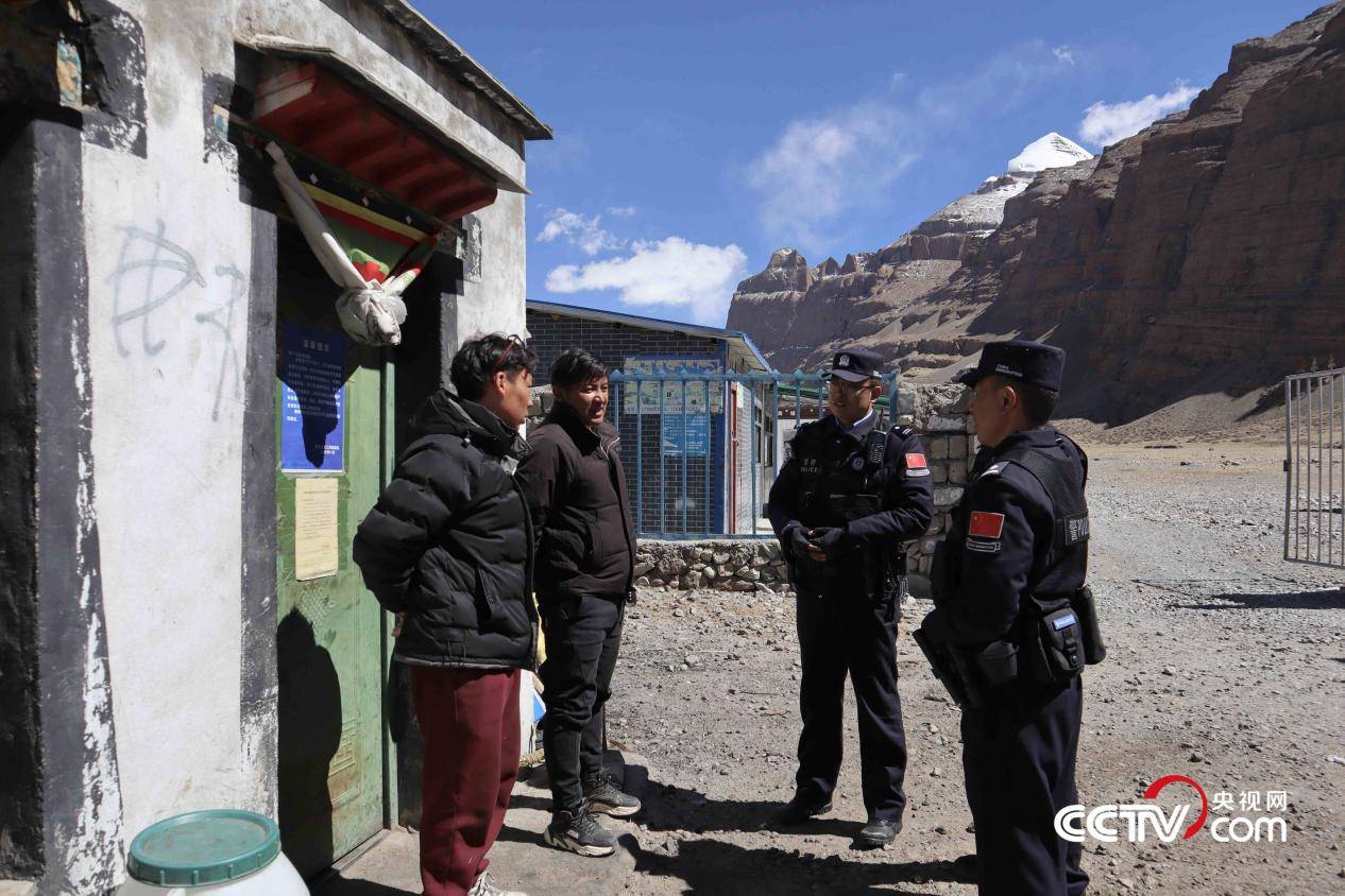 (塔尔钦边境派出所民警在冈仁波齐脚下巡逻、排查(左三为巴桑平措) 央视网记者 王静远 摄)