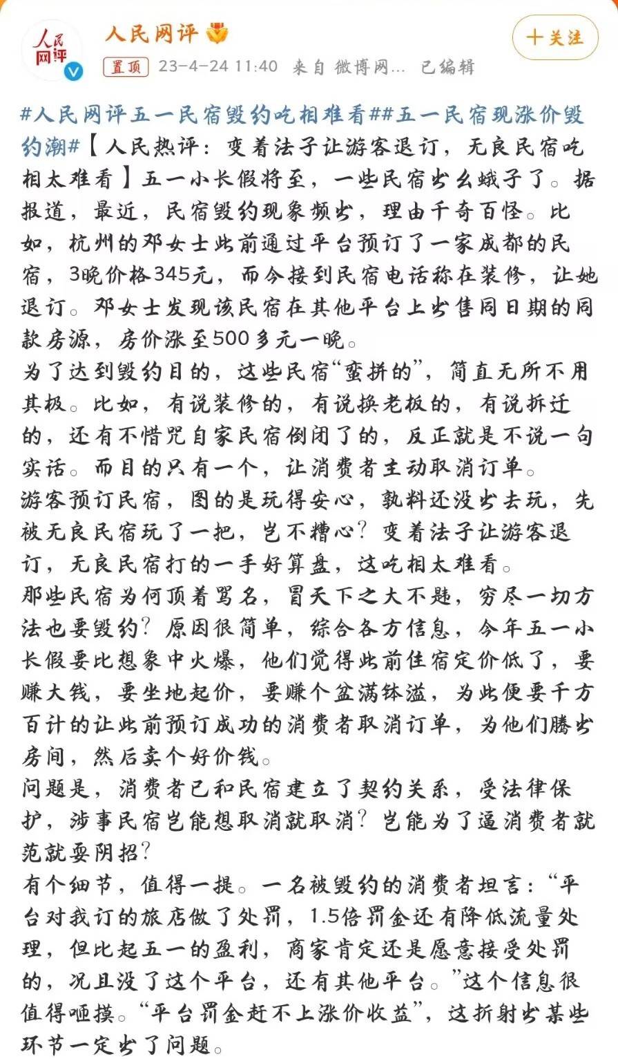近日,不少消费者在社交媒体反馈称,临近“五一”假期,自己早就订好的民宿遭到民宿主“毁约”,房东要求房客自行退订的理由千奇百怪,如装修、倒闭、老板换人等;退订后的房源“坐地起价”,价格较预订时上涨明显。