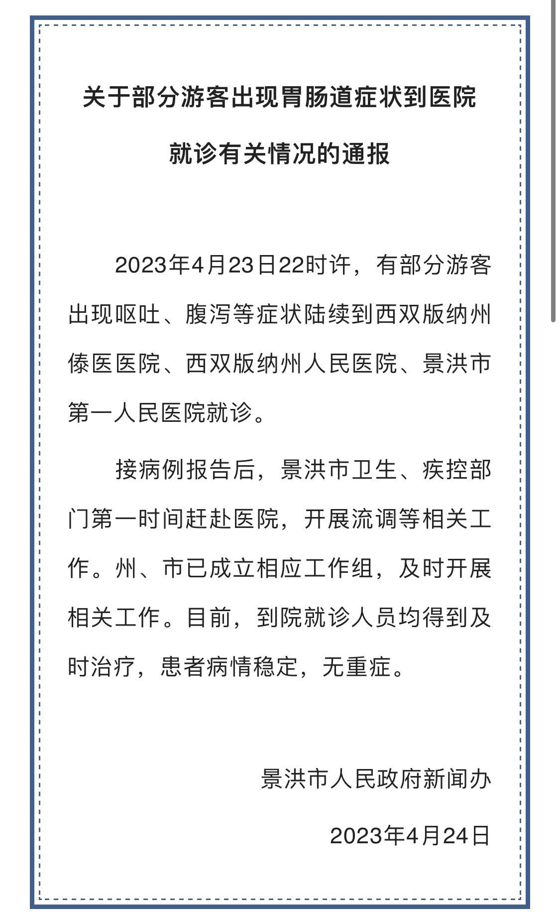 4月24日,云南省西双版纳州景洪市人民政府新闻办就部分游客出现胃肠道症状到医院就诊有关情况发布通报,称州、市已成立相应工作组,及时开展相关工作。目前,到院就诊人员均得到及时治疗,患者病情稳定,无重症。