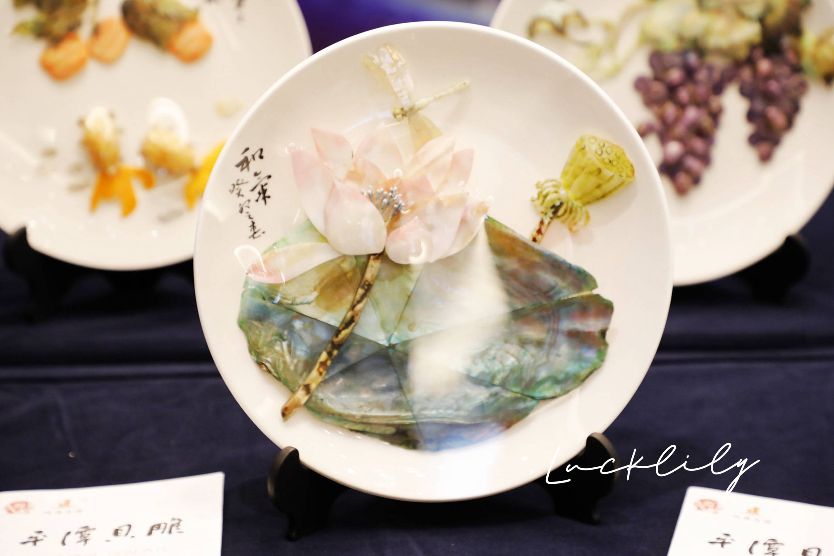 上幅贝雕作品:和气,夏日清风下的荷田央央,底下的莲叶用到的竟是蚌壳,而荷花花瓣的雕琢使用的是贝壳,浅粉相缀,让硬生生的贝壳展现出了“温婉柔软”的质地,真是令人叫绝。