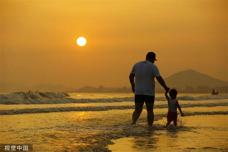 2023年4月23日,三亚,家长带着孩子在美丽夕阳中游玩。