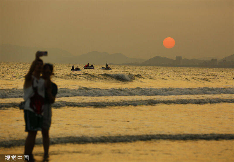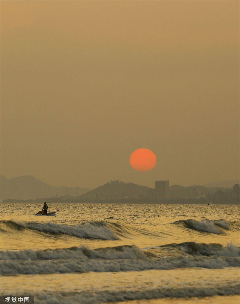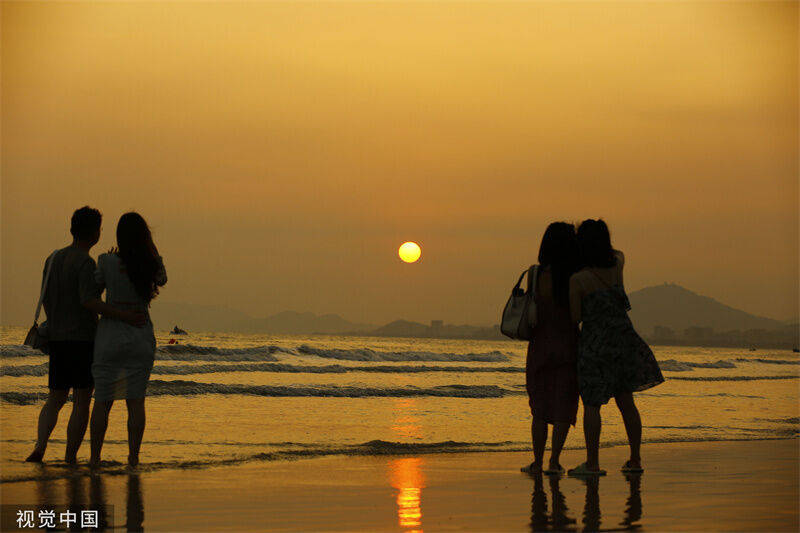 2023年4月23日,三亚,游客在美丽夕阳中游玩。