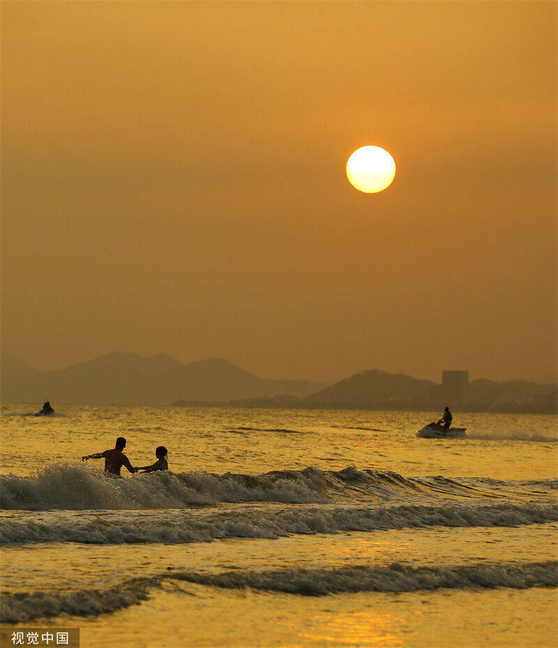 2023年4月23日,三亚,两名小朋友在美丽夕阳中玩耍。