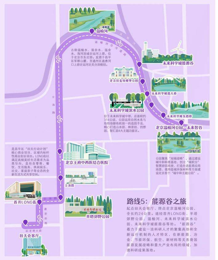 起点回天会客厅、终点北京温榆河公园,全长约24公里。途经首开LONG街、半塔郊野公园、温榆河、未来科学城滨水公园、未来科学城能源谷等地。“能源谷”着力于建设一流科研人才的聚集高地和全新运行机制的人才特区,在新能源、冶金、节能环保、航空、新材料等关系我国能源发展战略和重大产业布局的领域,加速科研成果落地。