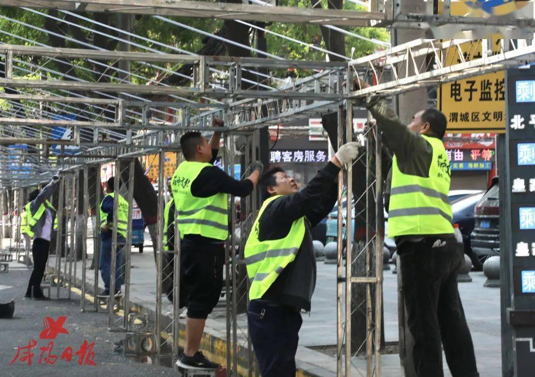 工作人员在北平街搭建面食大会展台。( 咸阳日报全媒体记者 王晓田 摄)