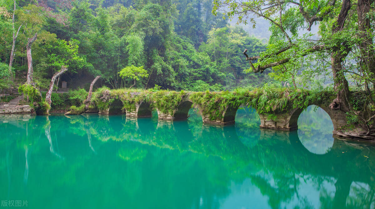 都说九寨归来不看水,如果有例外那就是荔波。小七孔山峦翠水,古桥瀑布,满目皆绿。卧龙潭水色惊艳,宛如一块绿翡翠。小七孔古桥,桥身爬满藤蔓和蕨类青草,愈发显得小桥的古朴与久远。