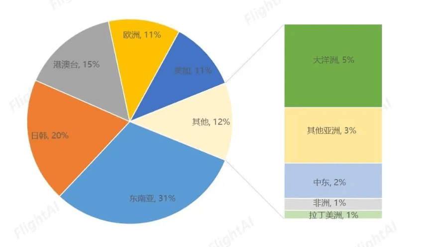 今年五一期间,出境机票搜索热度同比 2019 年同期恢复至 120%,出境游酒店搜索热度同比 2019 年恢复至约 70%。出境游目的地分布上,66% 的飞行意向集中在东南亚、日韩、港澳台亚太地区。同比 2019 年,东南亚增幅在 50% 以上。从机票数据来看,出境客源地主要来自北上广深一线城市及部分省会城市。尤其是上海,贡献了 30% 的出境订单。此外,苏州、无锡也上榜出境游前 10 客源地。