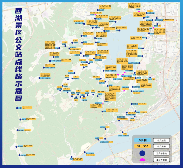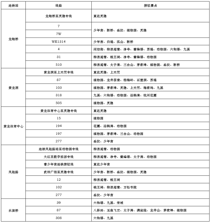 “五一期间”,围绕景区周边的10座地铁站(1号线龙翔桥站、3/10号线黄龙体育中心站、1/2号线凤起路站、1/5号线城站站、3号线黄龙洞站、4号线水澄桥站、5号线侯潮门站、6号线枫桦西路站、7号线吴山广场站、19号线西溪湿地北站),公交集团将继续配套开行“一站式”换乘接驳公交线,可直达进出景区,具体线路详见下表: