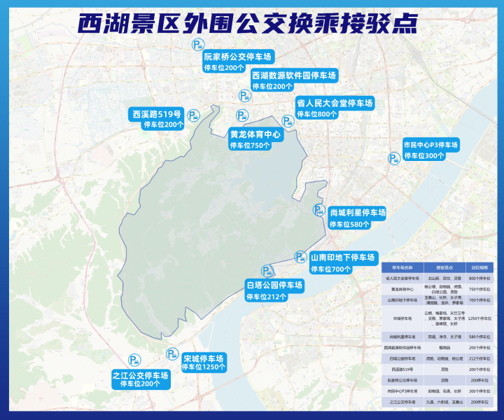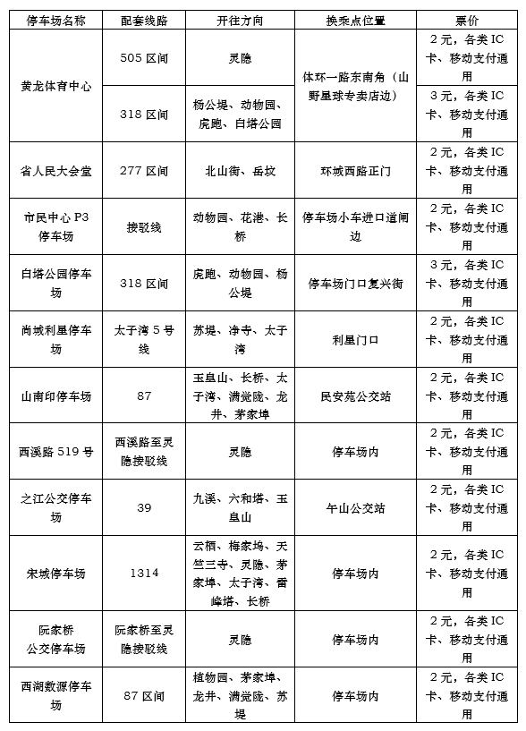 结合“五一”假期西湖景区实施机动车单双号限行临时管控措施,黄龙体育中心停车场、省人民大会堂停车场、尚城利星停车场、山南印停车场、阮家桥公交停车场、宋城停车场、西湖数源软件园停车场、之江公交停车场、白塔公园停车场、西溪路519号停车场、市民中心P3停车场等11处停车场将开通景区换乘线。市民游客可将自驾车停放在上述停车场,然后换乘公交进入西湖景区,具体线路详见下表: