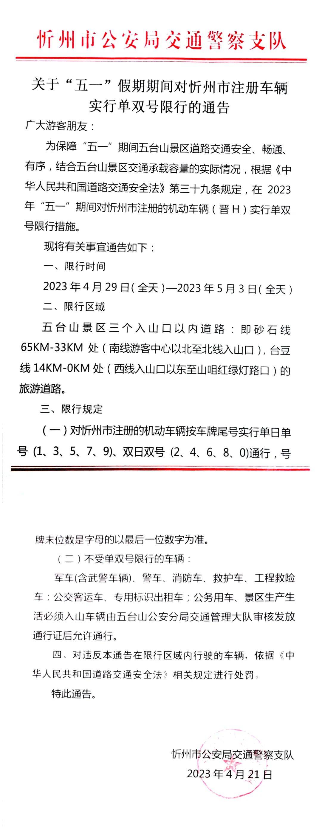 为保障“五一”期间五台山景区道路交通安全、畅通、有序,结合五台山景区交通承载容量的实际情况,根据《中华人民共和国道路交通安全法》第三十九条规定,在2023年 “五一”期间对忻州市注册的机动车辆(晋H)实行单双号限行措施。 现将有关事宜通告如下: