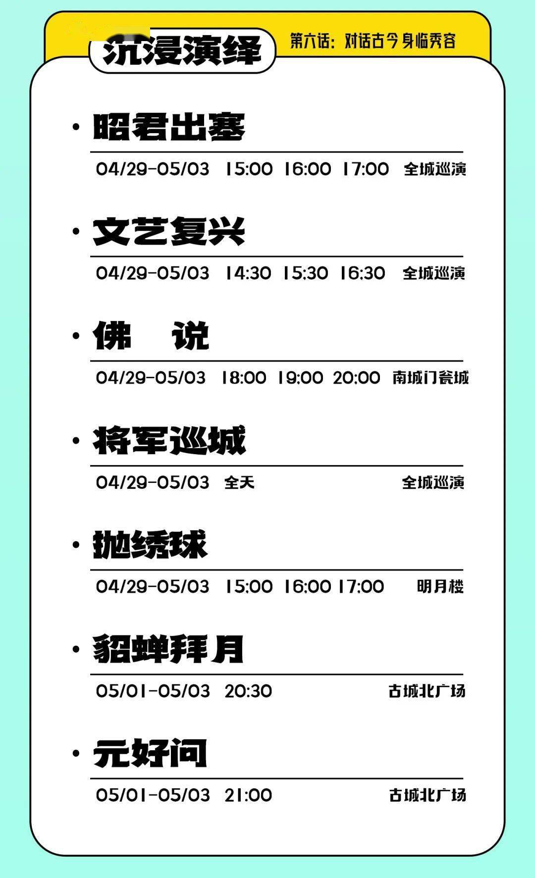 沉浸式演绎全新升级《昭君出塞》、《将军巡城》、《抛绣球招亲》、《舞蹈快闪》、《佛说》......新的节目,新的形式,这个五一给你不一样的视听盛宴!