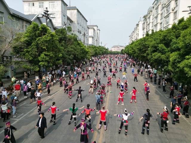 4月23日上午,伴随着乐作舞曲,云南省红河哈尼族彝族自治州红河县“仰阿娜”文化旅游节活动开始了。莲花大道上,由35个队伍参与的万人乐作舞跳了起来,不同单位、各乡镇不同民族的人们,都穿上了节日盛装,邀请居民和游人共同欢跳。