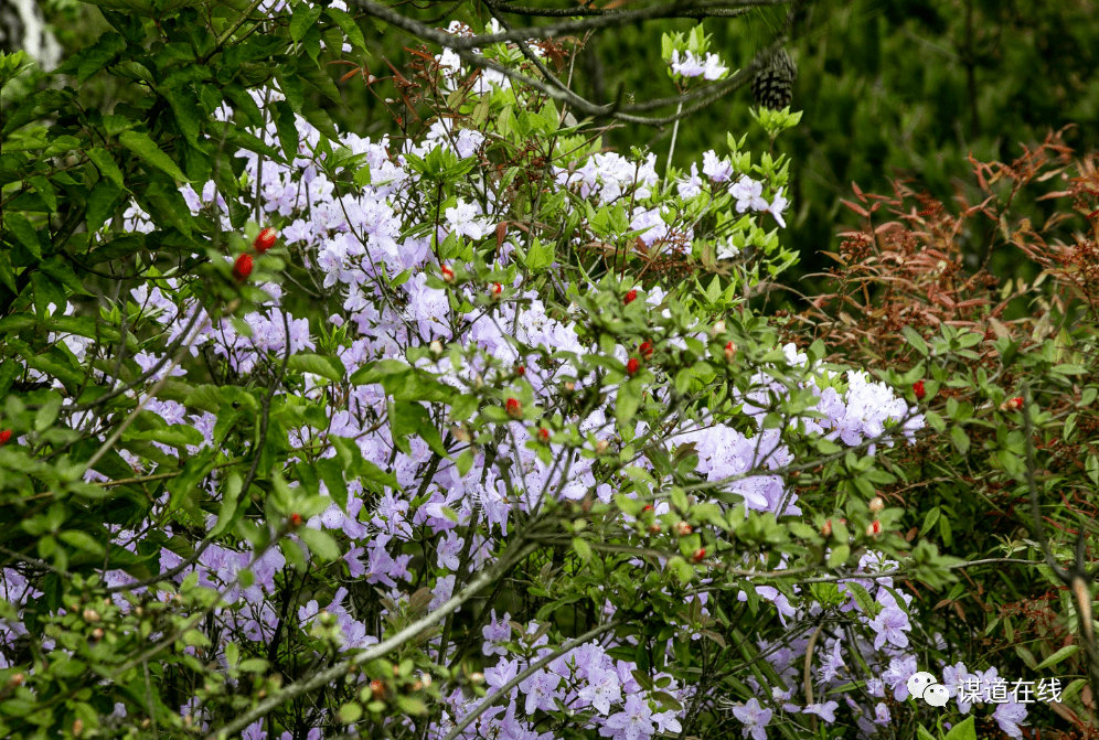 山野的红杜鹃、白杜鹃、紫杜鹃次第开放在森林里、峡谷旁、悬崖边,放眼望去,美如画卷。空山新雨后,云雾缭绕,杜鹃、云海构成了苏马荡最为独特的一道风景,正翘首以盼候鸟归巢。