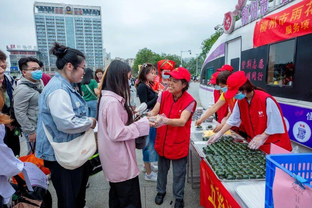 3天假期里,102名志愿者在柳州火车站东广场免费为游客提供糯米饭艾粑粑和甘草姜茶
